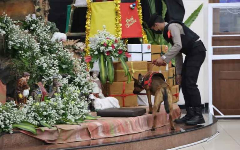 UNGARAN – Polres Semarang melakukan sterilisasi tempat ibadah jelang perayaan Natal 2021. Sejumlah personil dari Satuan Sabhara dibantu anjing pelacak unit K-9 melakukan penyisiran di Gereja Kristus Raja Ungaran, Kabupaten Semarang, Jumat (24/12/2021).