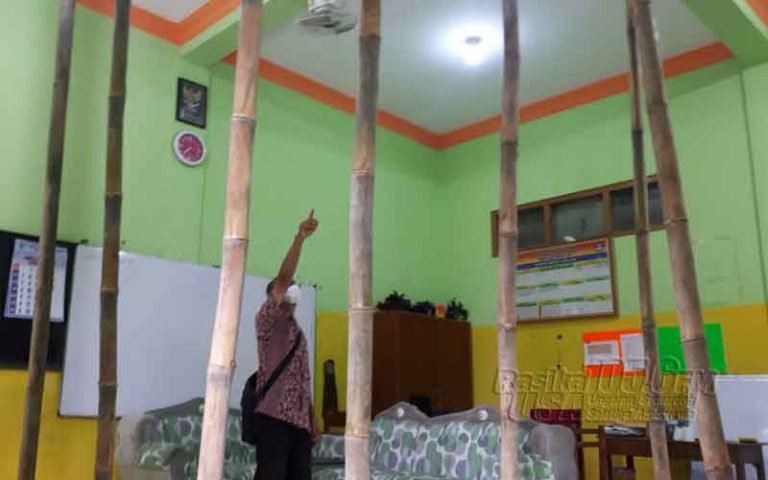 “Balok tulangan bagian atas retak, makanya disangga pakai bambu. Sementara ruangan juga tidak digunakan untuk kegiatan belajar mengajar (KBM),” ungkapnya Selasa (2/11/2021).