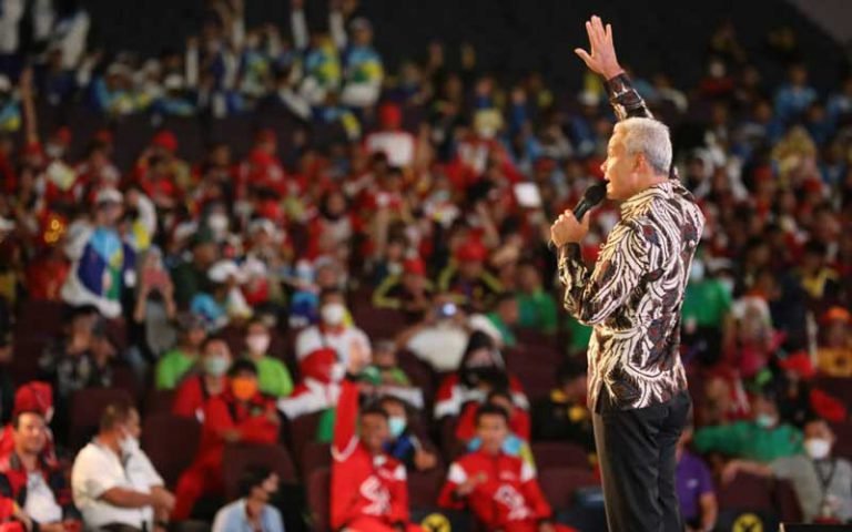 Ganjar yang hadir didampingi istri, Siti Atikoh, langsung mendapat sambutan luar biasa dari seisi Holy Stadium. Mereka merupakan perwakilan kontingen provinsi peserta PeSOnas 2022. Suasana semakin riuh saat Ganjar naik ke atas panggung untuk menyapa dan memberikan sambutan.