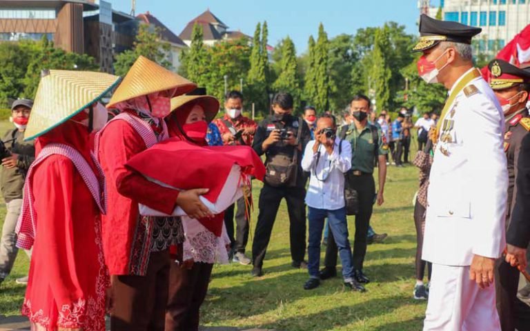 SEMARANG – Pemandangan unik terlihat saat peringatan upacara HUT 77 RI di Lapangan Pancasila Semarang, Rabu (17/8/2022). Yaitu, adanya buruh migran yang memberikan bendera merah putih ukuran besar kepada Gubernur Jateng Ganjar Pranowo.