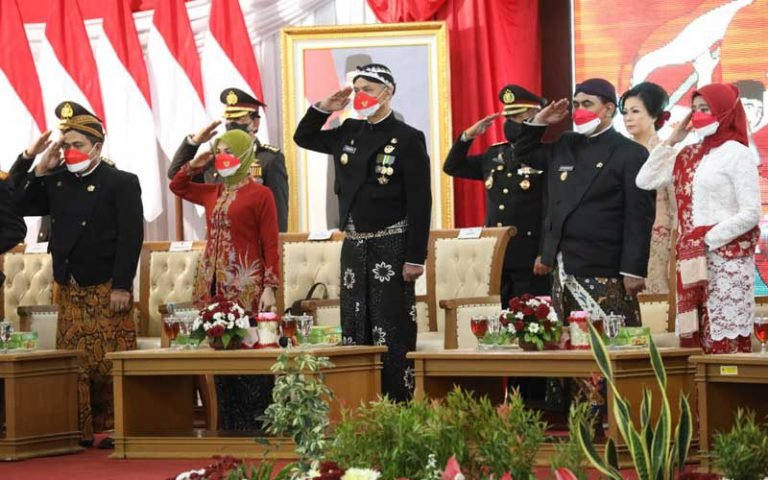 Semarang – Gubernur Jawa Tengah Ganjar Pranowo dan Wakil Gubernur Jawa Tengah Taj Yasin Maimoen tampil serasi saat mengikuti upacara peringatan detik-detik Proklamasi Kemerdekaan Republik Indonesia secara virtual di Gedung Gradhika Bhakti Praja, Rabu (17/8/2022). Keduanya kompak mengenakan pakaian adat Jawa Tengah dalam upacara yang dihadiri Presiden Joko Widodo sebagai inspektur upacara.