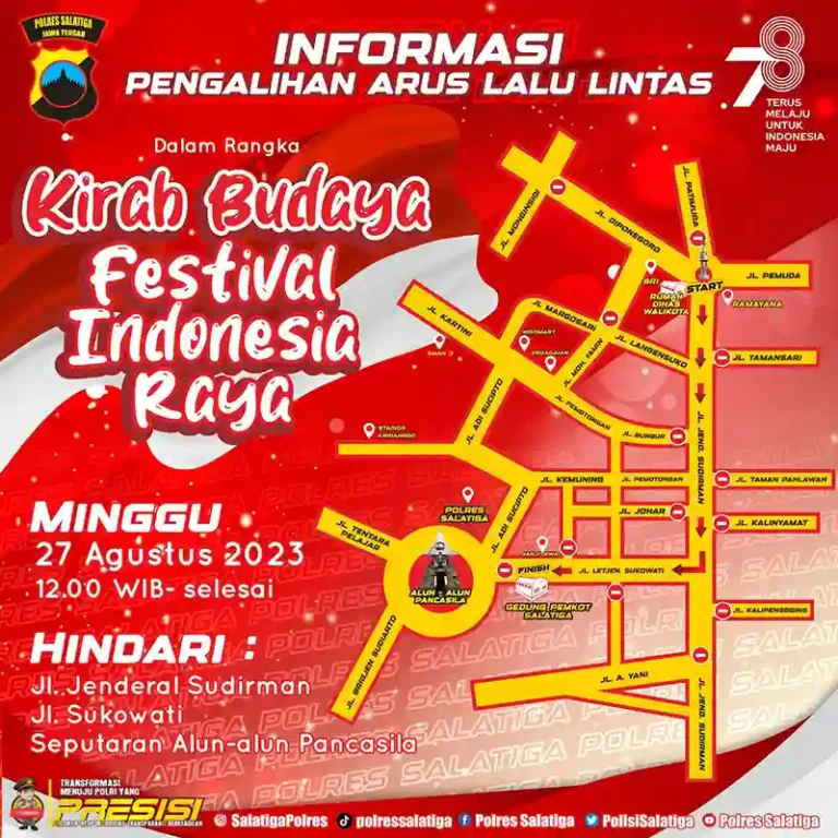 RASIKAFM.COM | SALATIGA - Polres Salatiga akan melaksanakan rekayasa arus lalu lintas dengan penutupan sejumlah ruas jalan saat digelar Kirab Budaya Festival Indonesia Raya yang akan dimulai dari Rumah Dinas Walikota Salatiga di Jalan Diponegoro No 1 Salatiga dan berakhir di Halaman Pemerintah Kota Salatiga Jalan Letjend Sukowati, pada hari Minggu 27/08/3023.