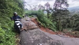Hujan deras menyebabkan teras rumah dan badan jalan di Perumahan Griya Bukit Jati Asri, Ungaran Timur, ambles hampir 3 meter. Dua rumah warga terdampak di Kabupaten Semarang, Kamis (12/2/2026) siang. Peristiwa dipicu curah hujan tinggi dan luapan air, ditangani polisi dan BPBD dengan pembuatan saluran sementara.