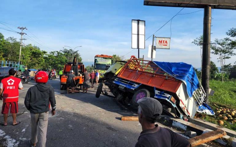 Musibah Kecelakaan lalu lintas kembali terjadi di Jalan lingkar Salatiga (JLS) .Sebuah truk bermuatan kelapa diduga mengalami gagal fungsi rem saat turun dari arah Magelang.