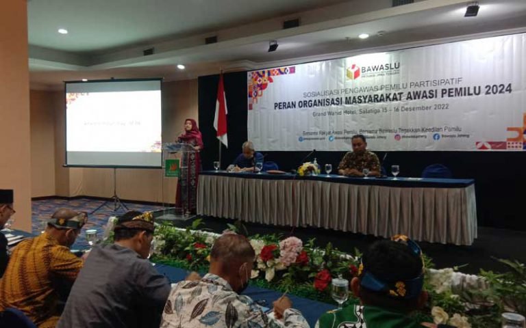 RASIKAFM.COM|SALATIGA – Badan Pengawas Pemilu (Bawaslu) Jawa Tengah gelar sosialisasi Pengawas Pemilu Partisipatif. Dalam acara ini ratusan peserta dari berbagai elemen masyarakat sejateng hadir, acara yang mengusung tema Peran Organisasi Masyarakat Awasi Pemilu 2024 ini berlangsung di hotel Grand Wahid Salatiga.