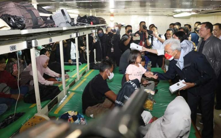 Sebelum melepas, Menko PMK Muhadjir Effendy dan Gubernur Ganjar menyapa para penumpang KM Kelimutu. Beberapa di antaranya adalah warga perantau dan akan pulang ke Karimunjawa.