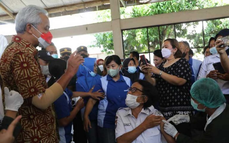 “Sekarang kita genjot lagi booster-nya karena ada varian baru yang insyaallah tidak seganas varian sebelumnya. Tapi kita tidak boleh lengah. Maka kami dengan Dinkes dibantu oleh TNI-Polri, kita bekerja sama, dan sekarang kita di Sukoharjo dari Puskesmas, dari Kabupaten semuanya bergerak agar teman-teman dan saudara kita semua bisa di-booster,” kata Ganjar usai meninjau vaksinasi booster untuk karyawan PT Batik Arjuna Cemerlang, Sukoharjo, Kamis (30/6/2022).