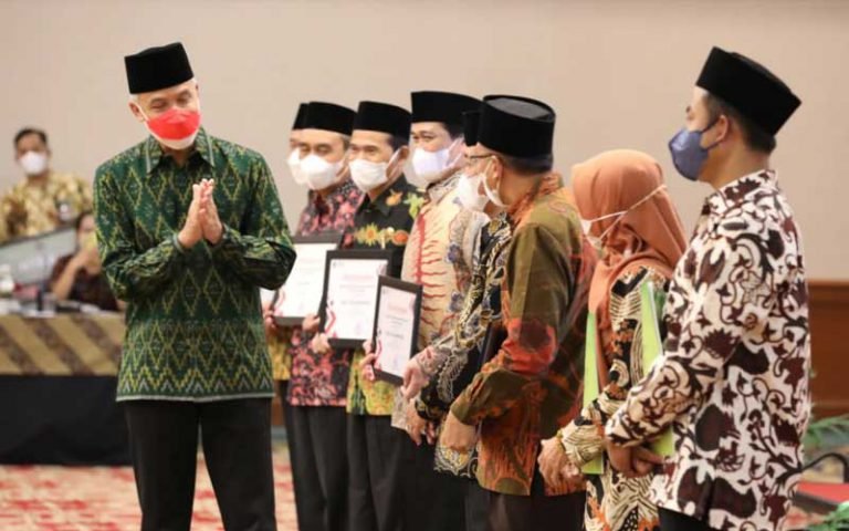 SOLO – Gubernur Jateng Ganjar Pranowo menghibahkan Rp 281 Miliar kepada Kanwil Kementerian Agama Jawa Tengah. Hibah tersebut untuk bantuan insentif pengajar keagamaan dan BOS Daerah Madrasah Aliyah (MA).