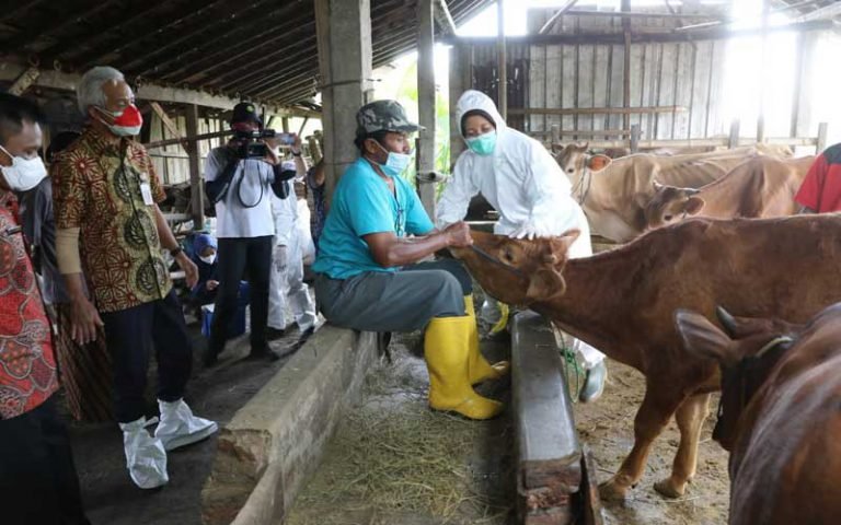 SUKOHARJO – Gubernur Jawa Tengah Ganjar Pranowo meninjau vaksinasi penyakit mulut dan kuku (PMK) di Desa Genengsari, Kecamatan Polokarto, Kabupaten Sukoharjo, Kamis (30/6/2022). Ganjar menegaskan percepatan vaksinasi menjadi pencegahan utama penularan PMK di Jawa Tengah.