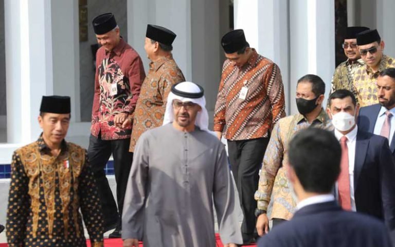 SOLO – Gubernur Jawa Tengah, Ganjar Pranowo mendampingi Presiden Joko Widodo dan Presiden UAE, Mohammad bin Zayed meresmikan Sheikh Zayed Grand Mosque Solo, Senin (14/11). Mengenakan baju batik dan berpeci hitam, Ganjar nampak berada dalam rombongan tamu-tamu kehormatan saat peresmian berlangsung.