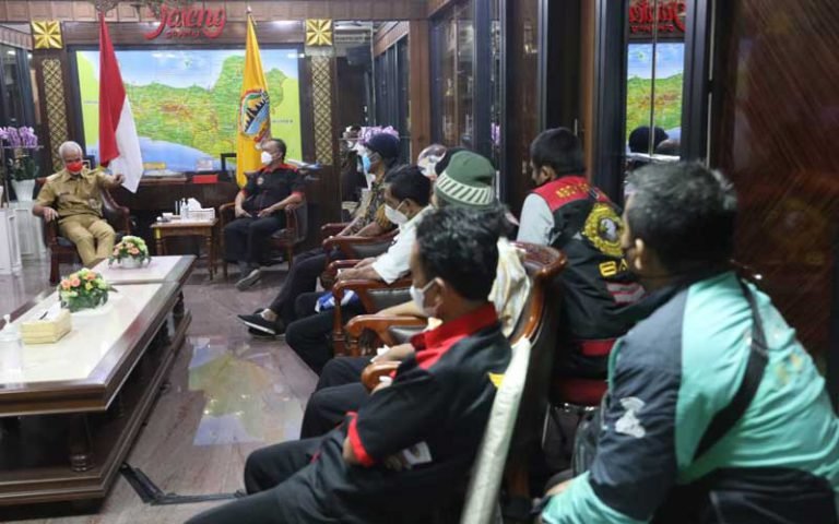 SEMARANG – Sejumlah perwakilan driver ojek online (ojol) se Jawa Tengah menemui Gubernur Jawa Tengah, Ganjar Pranowo, Senin (4/4). Mereka mengadukan sejumlah persoalan yang dihadapi antara driver ojek online dengan aplikator tempat mereka bekerja, seperti Gojek, Grab, Shopee dan Maxim.