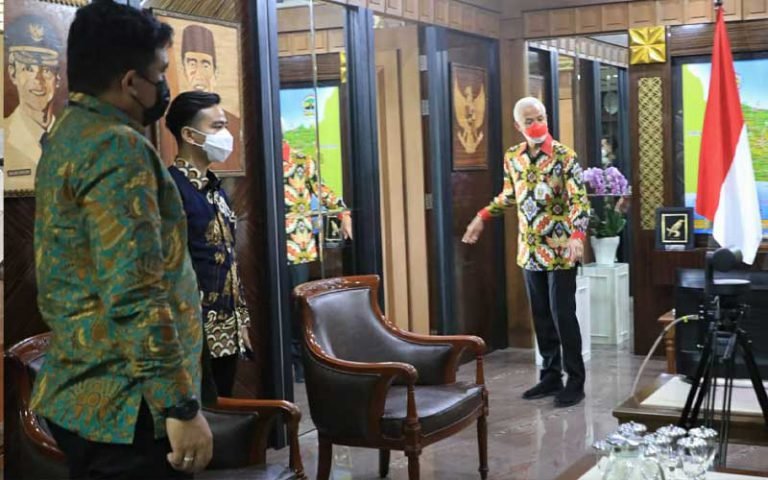 SEMARANG – Putra sulung dan menantu Presiden Joko Widodo, Gibran Rakabuming Raka dan Bobby Nasution mendadak mengunjungi Gubernur Jawa Tengah, Ganjar Pranowo, Senin (28/3). Keduanya mendatangi kantor Ganjar dan ditemui di ruangan pribadinya.