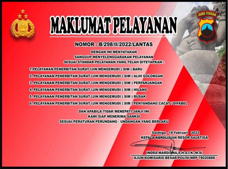 Wujud keseriusan memberikan pelayanan itu Satpas Polres Salatiga membuat komitmen dan menyatakannya dalam bentuk maklumat pelayanan yang ditanda tangani oleh Kapolres Salatiga, AKBP Indra Mardiana.