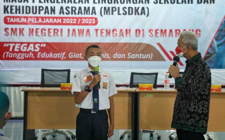 SEMARANG – Muhammad Ariel siswa baru SMK N Jateng Kampus Semarang, nampak tegang berbincang dengan Gubernur Jateng Ganjar Pranowo, Selasa (12/7/2022). Bocah yatim-piatu ini mengaku senang bisa menuntut ilmu di sekolah berasrama milik Pemprov Jateng, karena segala kebutuhan sekolah diberi gratis, mulai dari sandang hingga makan.