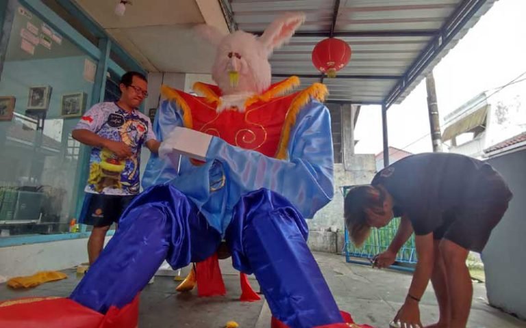 Ondel-ondel ini dibuat menyerupai kelinci dengan dibalut kain dengan warna biru karena pada tahun ini merupakan shio kelinci air.