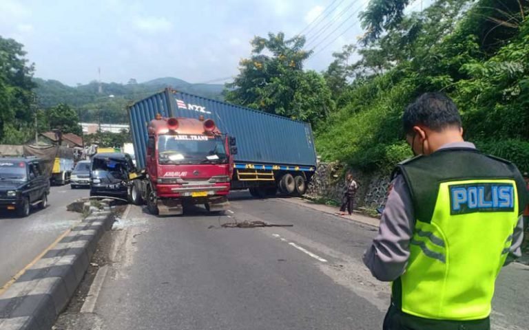 UNGARAN – Truk kontainer dengan nopol H 8590 OA bermuatan 19 ton kapas terguling di tanjakan Tuntang, tepatnya setelah jembatan Tuntang dari arah Salatiga menuju Bawen, Jumat (18/3/2022). Truk tersebut diduga tidak kuat menanjak sehingga melorot ke belakang dan menghantam satu unit kendaraan roda empat yang ada di belakangnya.