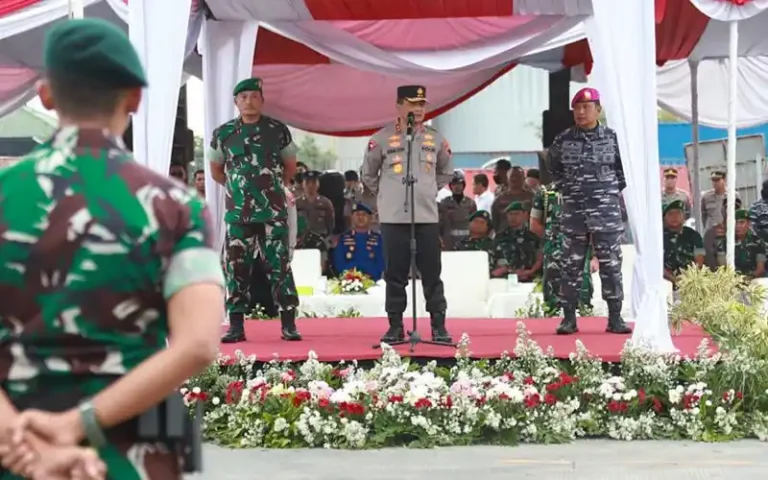 Semarang – Pangdam IV / Diponegoro Mayjen TNI Widi Prasetijono dan Kapolda Jawa Tengah Irjen Pol Ahmad Luthfi memimpin apel bersama TNI – Polri Jawa Tengah tahun 2023 yang dilaksanakan di dermaga TNI Angkatan Laut Semarang, Rabu pagi (15/3/2023)