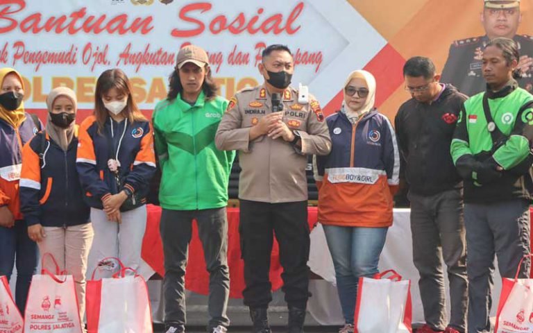 Ojek Online yang hadir di halaman Mapolres Salatiga terdiri dari Gojek, Jeggboy, Jegggirl dan Wira Wiri. Paket bantuan yang diberikan sebanyak 250 paket yang terdiri dari 5 kg beras, 1 liter minyak goreng, teh celup, gula pasir dan mie instan.
