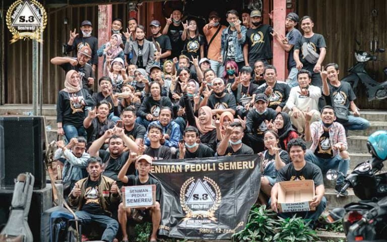 Puluhan anggota Paguyuban Sedulur Seniman Seniwati S3 Kabupaten Semarang melakukan aksi penggalangan dana untuk korban erupsi gunung Semeru Rabu 12 Januari 2022 bertempat di pasar Kembangsari Tengaran.