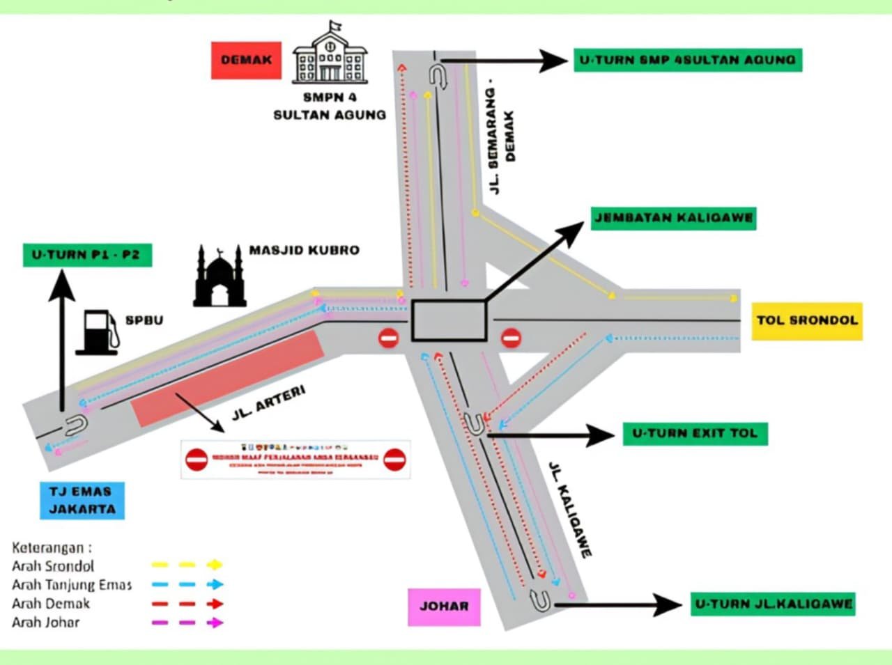 - Kendaraan dari Tol menuju Demak, keluar off ramp ke kiri dan memutar sebelum rel kereta kaligawe