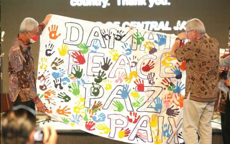 “Apakah yang seperti ini mau dibiarkan saja, tentu saja tidak. Dalam kesempatan ini saya titip kepada organisasi ini agar mereka juga menyampaikan kepada masyarakatnya, kepada pemerintahnya yang ada di negara masing-masing terkait pesan damai ini,” ungkap Ganjar.