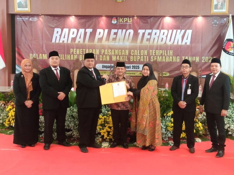 RASIKAFM.COM | UNGARAN – Komisi Pemilihan Umum (KPU) Kabupaten Semarang secara resmi menetapkan pasangan calon (paslon) nomor urut 1, Ngesti Nugraha-Nur Arifah, sebagai Bupati dan Wakil Bupati Semarang terpilih pada Pemilihan Kepala Daerah (Pilkada) 2024. Penetapan dilakukan melalui rapat pleno terbuka di KPU setempat pada Senin (6/1/2025), setelah dipastikan tidak ada gugatan yang terdaftar di Mahkamah Konstitusi (MK).