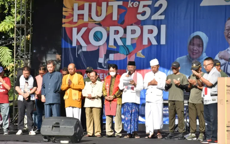 RASIKAFM.COM | SALATIGA – Peduli ditunjukkan oleh Pemerintah Kota Salatiga terhadap peristiwa di Jalur Gaza, Palestina. Penjabat Wali Kota Salatiga, Sinoeng N. Rachmadi, bersama Sekda, Ketua DPRD, dan tokoh pemimpin agama Salatiga melakukan doa bersama. Kegiatan ini berlangsung dalam Peringatan HUT Ke-52 Korpri Kota Salatiga di Halaman Pemkot Salatiga, Jumat (24/11/2023).