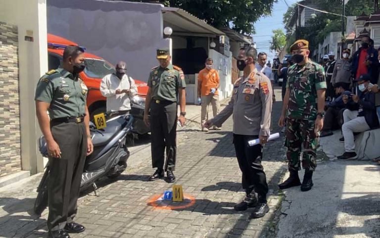 SEMARANG – Unit Resmob Satreskrim Polrestabes Semarang bersama Polisi Militer Kodam (Pomdam) IV Diponegoro melakukan olah tempat kejadian perkara (TKP) lanjutan pada kasus penembakan istri TNI, Kamis (21/7/2022).