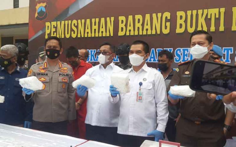 SEMARANG – Polrestabes Semarang melakukan pemusnahan narkotika jenis sabu-sabu seberat 8,4 kilogram hasi penindakan dari penyelundupan narkoba jaringan antar Provinsi di Mapolrestabes Semarang, Senin (20/12/2021).