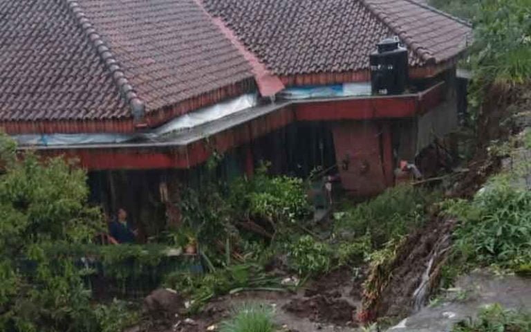 Rumah Linuwih, warga Dusun Krangkeng RT 06 RW 12 Desa Batur, Getasan, Kabupaten Semarang tertimpa longsoran pondasi SDN Batur 04 akibat tak kuat menahan genangan air, Selasa (23/11/2021) sore. (Video: dok. Relawan SAR Buser)