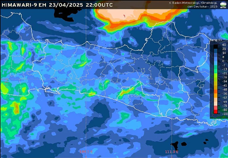 - Sore – awal malam: umumnya berawan, hujan ringan – sedang tersebar tidak merata di wilayah Jawa Tengah.