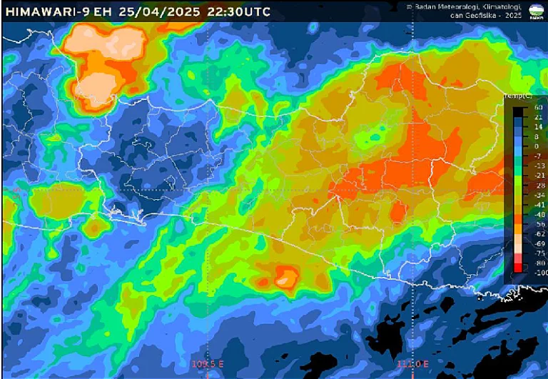 - Sore – awal malam: umumnya berawan, berpotensi hujan ringan – sedang tersebar tidak merata di wilayah Jawa Tengah.