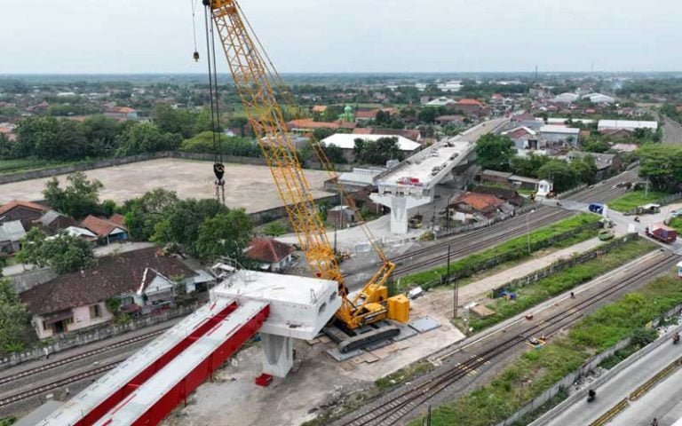 DEMAK – Pembangunan jembatan layang (Fly Over) Ganefo di Kecamatan Mranggen-Demak mencapai 79 persen. Konstruksi kini difokuskan memasang glagar box baja atau steel box girder. Pemasangan dilakukan pada jeda waktu perlintasan kereta api supaya tidak menggangu perjalanan kereta.