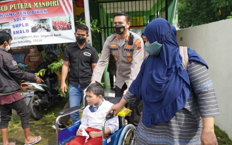 Kapolres Semarang AKBP Yovan Fatika turun langsung dengan membantu mendorong kursi roda para siswa berkebutuhan khusus tersebut.