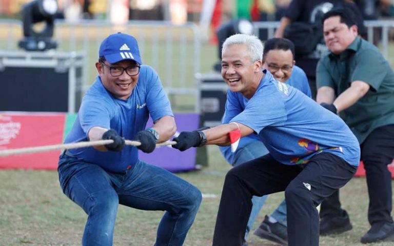 JAKARTA – Gubernur Jawa Tengah Ganjar Pranowo tampil semangat di acara Narasi Merayakan Indonesia di Lapangan Sepakbola Sumantri Jakarta Selatan, Sabtu (20/8/2022). Ganjar pun mengikuti serangkaian lomba, mulai dari balap karung, makan krupuk hingga tarik tambang.