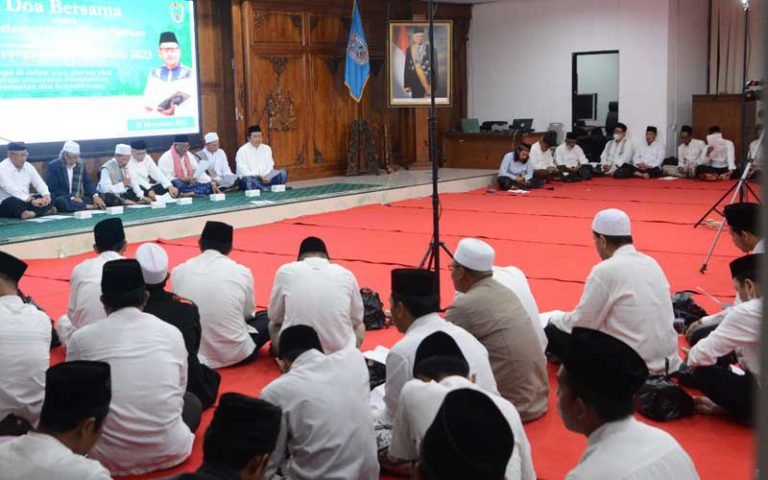 RASIKAFM. COM|SALATIGA – Ratusan jamaah gelar doa bersama akhir tahun 2022 dan menyambut tahun baru 2023. Nampak dalam acara tersebut Penjabat Wali Kota Salatiga, Sinoeng N Rachmadi, Sekretaris Daerah, segenap Forkopimda, ketua MUI dan Kyai turut dalam mujahadah yang dilaksanakan di Aula Kaloka Gedung Setda Lantai 4, Sabtu (31/12/22).