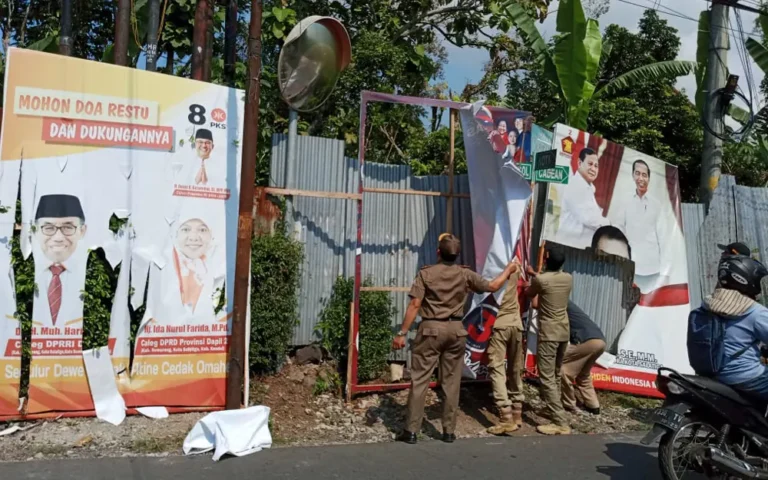 RASIKAFM. COM | SALATIGA – Petugas satuan polisi pamong praja (Satpol PP) bersama Badan Kesatuan Bangsa dan Politik (Kesbangpol) dan Bawaslu Kota Salatiga menertibkan ribuan baliho yang melanggar aturan daerah. Penertiban itu dilakukan mendekati pelaksanaan kampanye yang akan dimulai pada 28 November 2023 mendatang.