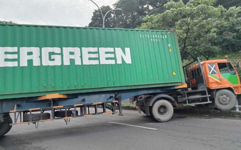 Satu unit truk kontainer bernopol B-9102-HB bermuatan garmen tak kuat menanjak hingga terguling menutup jalur arah turun. Akibatnya, kondisi lalu lintas saat jam berangkat kerja macet sampai depan Lapas Kedungpane.