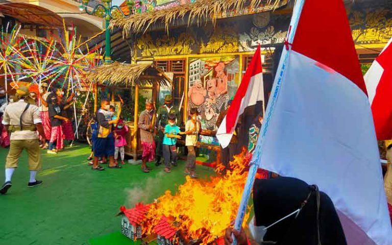 Atraksi teatrikal dimulai, sebuah replika bangunan rumah Kampung Batik yang diserbu lalu dibakar oleh tentara Jepang.