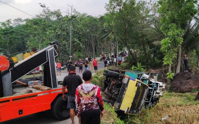 Truk bermuatan motor terguling di Jalan Suruh – Karanggede tepatnya di Bonomerto Kecamatan Suruh Kabupaten Semarang sekira pukul 10.00 WIB, rabu 31 Agustus 2022.