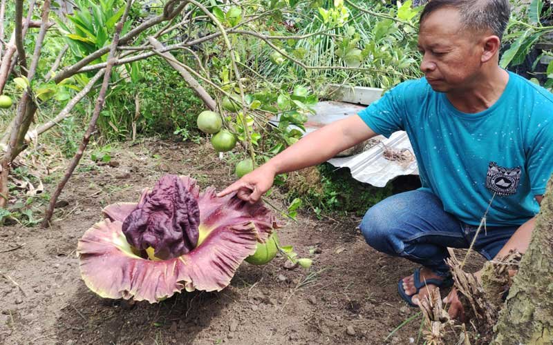 Listyono saat menunjukkan bunga bangkai dibelakang rumahnya